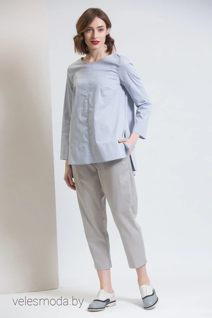 Стильная туника из хлопковой ткани свободного А-силуэта. По переду выполнены нагрудные вытачки, декоративная строчка , боковые швы заканчиваются разрезами, по спинке - кокетка со складкой по центру. Вырез горловины округлый. Перед и спинка разного уровня. Рукав втачной, свободный, длиной 3/4, внизу рукава - манжета. Модель прекрасно подойдёт к любым брюкам, джинсам, шортам.