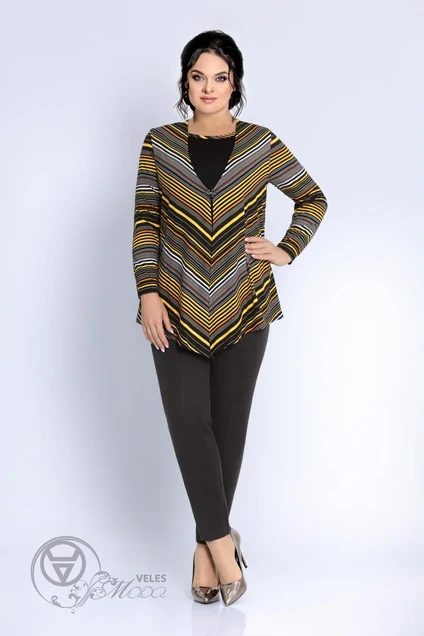 Туника из трикотажной вискозы в полоску с отделкой однотонном трапециевидного силуэта с двойным передом и рукавом рубашечного типа длиной до запястья. Полы переда фиксируются на крючок-застежку. Спинка из горизонтальной полосы. Длина изделия 70см длина рукава 53 см. Ширина изделия на уровне бедер 74см,76см,78см соответственно 58-62рр.