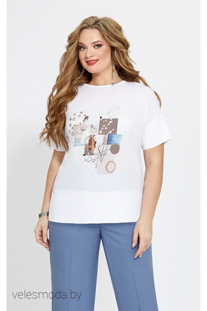 Туника прямого силуэта со спущенным рукавом и двойной манжетой, с разной длиной переда и спинки, разрезами в боковых швах и застежкой по горловине спинки на петлю-пуговицу. Полочка украшена принтом. Туника длина 67см, в 56р - 69см ширина на уровне глубины проймы 54,5 56,5 58,5 60,5 см (50,52,54,56рр) , ширина на уровне бедер 56,58,60,62 см. Длина рукава от горловины 34,5см . Ширина на уровне талии 54,5 56,5 58,5 60,5 см соответственно