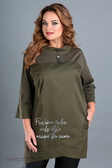 Туника свободного кроя из трикотажного полотна и стрейчевой х/б ткани. По переду планочка с тесьмой и пришитой подвеской. Плечо слегка спущенное, свободное. Рукава с тесьмой и логотипами. Бочки с карманами в швах. Декор – печать.