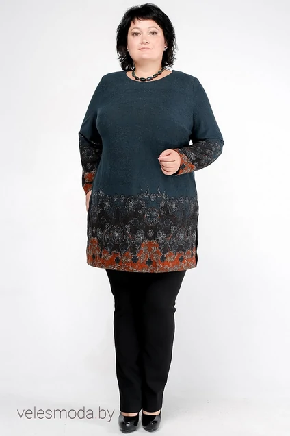 Туника прямого силуэта с круглым вырезом горловины. По переду-нагрудные вытачки, в боковых швах -разрезы. Выполнена из купонного трикотажного полотна.