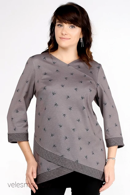 Туника свободного силуэта с фигурным вырезом горловины и втачным рукавом длиной 7\8 на манжете. Перед с нагрудными вытачками. Фигурная линия низа декорирована отделочной тканью. Выполнена из набивного академика.