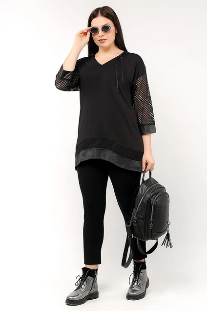 Туника свободного силуэта. V-образный вырез горловины с люверсами и шнурком. Рукава и вставка по низу изделия из ткани с прозрачной ячейкой. Отделку завершает пояс по низу изделия и манжеты из полотна с эффектом "кожи". выполнена из три котажного полотна.