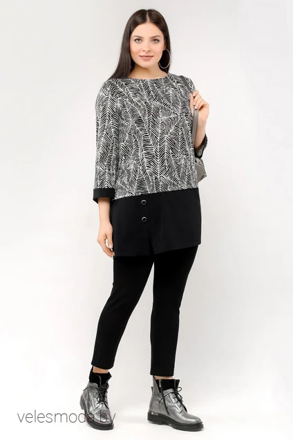Туника прямого силуэта. Втачной рукав длиной 7.8 дополнен манжетой. Низ изделия мо мкладкой и однотонной притачной деталью с планками и люверсами. Выполнена из штапеля. Цвет: черно-белый (набивной).