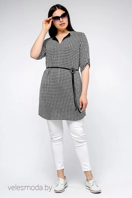 Туника прямого силуэта с фигурным низом и втачным рукавом длиной 3/4 с патой и пуговицей. Воротник стойка и разрез по переду отделаны контрастным однотоном. В комплекте аксессуар, который выступат в качестве пояса или укаршения на шею. Цвет: черно-белый (набивной).