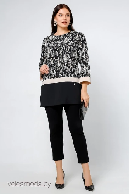 Туника пртямого силуэта с втачным рукавом на манжете. Перепд с нагрудными вытачками и фурнитурой. По спинке-встречная складка, в боковых швах-разрезы. Выполнена в комбинации однотонного и набивного штапеля.