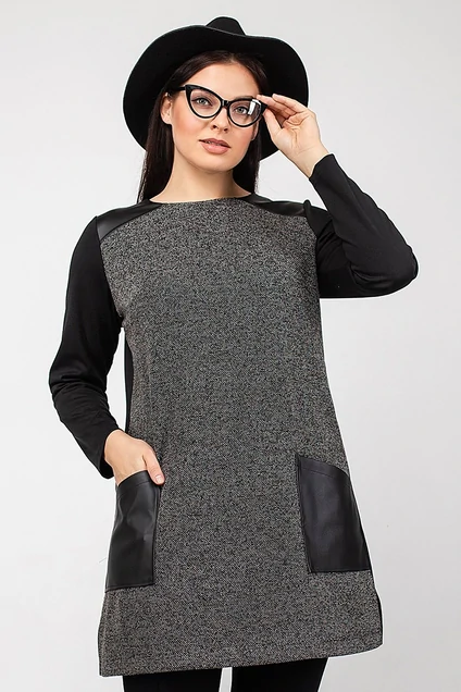 Туника прямого силуэта с втачным рукавом и нагрудными вытачкамию Перед с кокетками и накладными карманами из кожзама. В боковых швах разрезы. Выполнена в комбинации структурного трикотажа и академика.