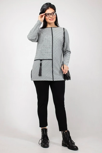 Туника прямого силуэта с втачным рукавом и нагрудными вытачками. Перед с контрастными кантами из кожзама и кистью. В боковых швах - разрезы. Основное полотно-трикотаж в клетку.