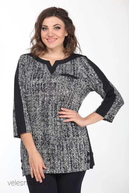 Туника прямого силуэта, удлиненная с полукруглым вырезом горловины и V-образным по центру. Перед с нагрудными вытачками и фигурной кокеткой из отделочной ткани. На левой стороне фигурный накладной карман с отрезной деталью из отделочной ткани. Спинка с кокеткой. Внизу боковых швов спинки и полочки вставка из отделочной ткани. По краям пришиты пуговицы. Рукава втачные, одношовные, длиной 3/4. Размеры 48-52: длина туники 70 см, длина рукава джемпера 50 см. Размеры 54-58: длина туники 72 см, длина рукава джемпера 51 см.