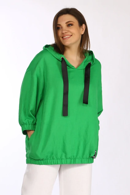 Модная Туника в спортивном стиле из умягченного льна не требующей утюжки, свободного силуэта с капюшоном и боковыми карманами, рукав и низ блузона на эластичной ленте.