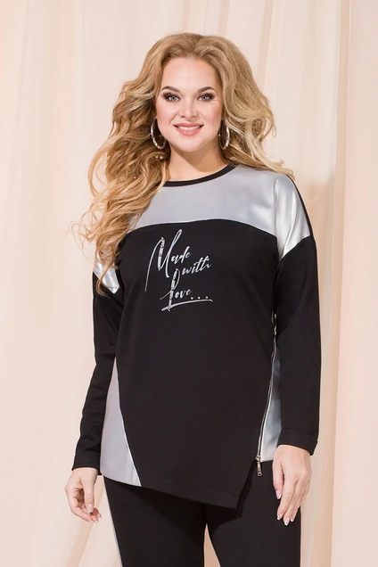 Эффектная туника в стиле спорт-шик, выполнена из мягкого трикотажа средней плотности со вставками из ткани под кожу. Туника свободного силуэта, с ассиметричной линией низа. По полочке расположена кокетка и подрезы со вставками из отделочной ткани. В бок вставлена функциональная молния. Лиф украшает печать с надписью и фиксированными металлическими бусинами (на заклепках). Рукав в модели спущенный, втачной, длинный.