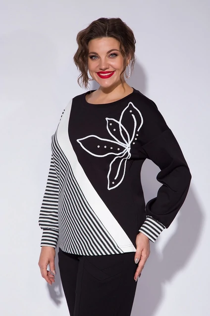 Модная женская туника, по типу джемпера, выполнена из сочетания однотонного трикотажа и трикотажа в полоску. Горловина округлой формы, на мягкой притачной планке. По линии лифа идет диагональная планка из молочного трикотажа. Одно плечо оформлено аппликацией в виде цветка с жемчужными бусинами! Рукав спущенный, по низу на притачной манжете со сборкой. Спинка без особенностей, однотонная.