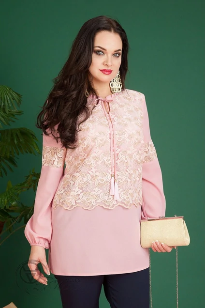 Удлиненная блузка, типа туники выполнена в сочетании однотонного шифона и декоративного кружева. Горловина огруглой формы; с притачной рюшей, с небольшим V-образным вырезом. Модель декоративными завязками-кисточками. По полочке наложена кружевная деталь с фигурной линией низа. Рука втачной, с кружевной вставкой, присборен на резинку по низу. Спинка выполнена из однотонного шифона, на кокетке с заложенной бантовой складкой по центру. Оригинальной крой и этнический узор выделит Вас из окружающих. Комплект дополнен однотонными синими брюками.