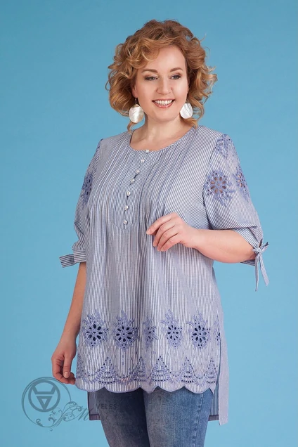 Стильная летняя туника из хлопковой ткани в мелкую полоску с кружевом. Модель с округлым вырезом горловины, с застежкой на планки с навесными пуговками в виде кристаллов. По полочке застрочены декоративные защипы. Рука втачной, средней длины с притачной манжетой, концы которой, можно завязать на бант. Спинка на кокетке. По центру заложена бантовая складка. Низ изделия фигурный; спинка длиннее, чем полочка. По боковым швам понизу предусмотрены разрезы. Идеальная вещь для жаркой летней погоды. Сезон: Весна-лето.
