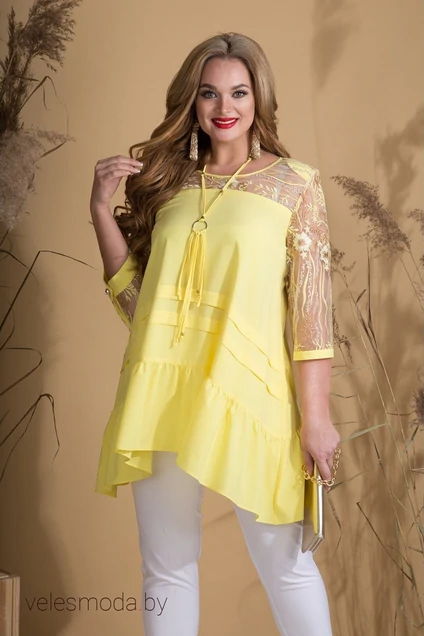 Ультрамодная туника свободного силуэта, выполнена из струящегося шифона с добавлением ажурного кружева. Модель с ажурной кокеткой по переду и округлым вырезом горловины. По полочке расположена заложенные декоративные складки. Рукав в модели втачной, длиной ¾-ти с притачной манжетой и застежкой на петлю и пуговицу. По низу изделия пришита присборенная деталь из основной ткани. Низ в изделии фигурной формы. Спинка прямая. В комплекте-съёмное украшение. Такой яркий и стильный вариант скроет не только все недостатки, но и подчеркнет все Ваши достоинства. Длина – 81 см, рукав – 54 см.