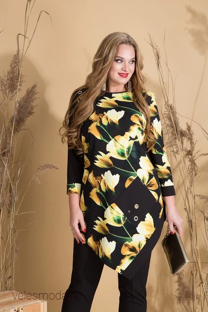 Комфортная туника из трикотажного полотна с ярким принтом. Модель свободного силуэта с фигурной линией низа. Округлый вырез горловины дополняет ассиметричная кокетка и накладной карман из отделочной. Рукав втачной, длиной ¾-ти с манжетом. По низу притачана планка из отделочной ткани. Спинка прямая, с ассиметричным низом. С боку расположен разрез для свободы движения! Оригинальный и свободный крой органично воплощают непринуждённый стиль casual с легким налетом романтичности. Отлично сочетается с джинсами, укороченными брючками и леггинсами! Длина по спинке – 66 (92 длинный край).