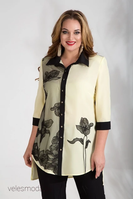 Ультрамягкая летняя рубашка-туника, выполнена из струящегося креп-шифона с добавлением ажурного кружева. Модель с отложным рубашечным воротником на стойке; с застежкой на петли и пуговицы на притачных планках контрастного цвета. По полочке ассиметричная кружевная деталь с аппликацией из кружева. Рукав в модели втачной, длиной ¾-ти с притачным манжетам. Спинка с кокеткой на сборку и отлетной кружевной вставкой. Такая модель отлично сочетается с однотонными брюками или юбкой, создавая яркий и притягательный образ. Длина по спинке около 85 см.