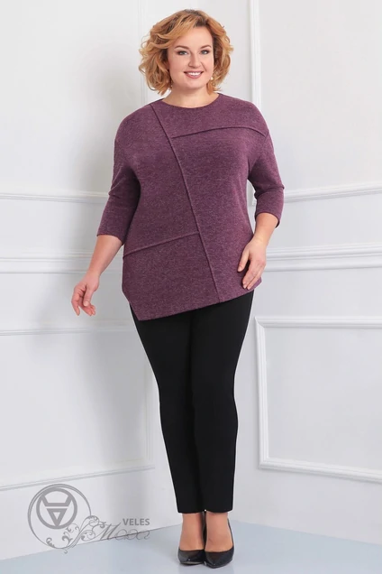 Повседневная трикотажная туника среднего объёма. Вырез горловины круглой формы. Рукав втачной рубашечный 3/4. По переду застрочены защипы. Низ фигурный, асимметричный. Длина-72,5см. ПОГ:54р-60см, 56р-62см, 58р-64см. ПОБ:54р-62,5см, 56р-64,5см, 58р-66,5см.