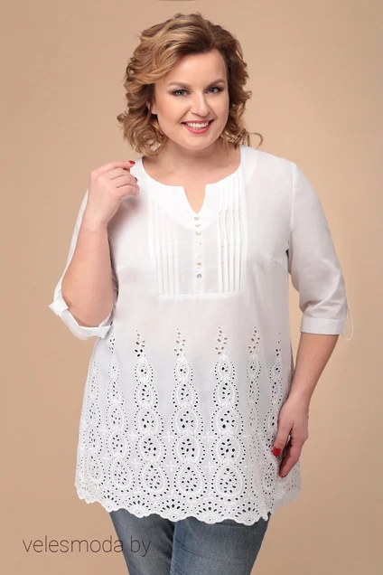 Летняя туника из натурального хлопка с вышивкой ришелье. По низу ажурный край, вырез горловины фигурный. Рукав втачной 3/4 с отворотом фиксирующимся на пату с пуговкой. По центру переда декоративный подрез с застроченными складками и пуговицами из ракушки.