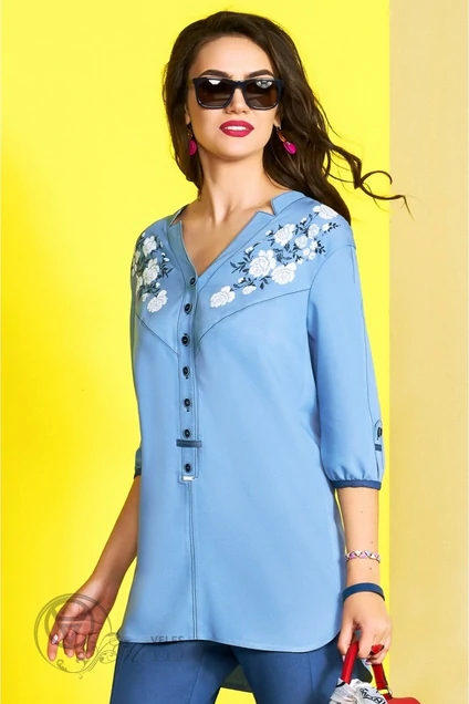 Туника с V-образным вырезом, из мягкого джинса, рубашечного покроя свободной формы (oversize) прямого силуэта. По переду туники нанесен дизайнерский принт с цветочным мотивом, в технике имитирующей вышивку. Перед оформлен косыми кокетками и вертикальной планкой «polo» , с застежкой на петли и пуговицы. Спинка оформлена прямой кокеткой, от шва кокетки выполнена небольшая встречная складка. Необычная конструкция боковые швы смещены в сторону переда, это зрительно заужает силуэт и делает фигуру стройнее. Низ блузки оформлен плавными фигурными линиями, спинка длиннее переда. Рукав втачной, свободный, с горизонтальной отрезной деталью от проймы и до низа рукава, низ оформлен патой и шлевкой.Туника длинной по спинке ≈82,0 см.Длинна рукава ≈ 39,0 см (3/4)