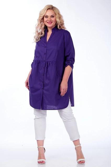 Туника женская, прямого силуэта. Выполнена из хлопковой ткани. Рукав втачной, длинный, по низу притачная манжета с застежкой на пуговицы. Длина рукава регулируется патой. Фигурный вырез горловины, оформленный отрезными планками. Застежка на пуговицах. Воротник стойка. По переду выполнены фигурные карманы с небольшой сборкой по верхнему краю. По линии талии подрез с небольшой сборкой. На спине изделия прямая кокетка, посередине бактовая складка. Низ изделия фигурный, по боковым швам выполнены разрезы.