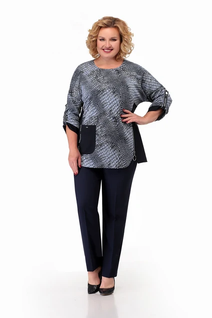 Туника женская прямого силуэта из облегченного трикотажного полотна с круглым вырезом горловины. Линия плеча спущенная, рукав одношовный с манжетой по низу и патой из декоративной тесьмы. Бочки полочки и накладной карман туники из отделочной ткани. В левый шов бочка полочки декорирован отделочной молнией Длина по спинке-71 см.