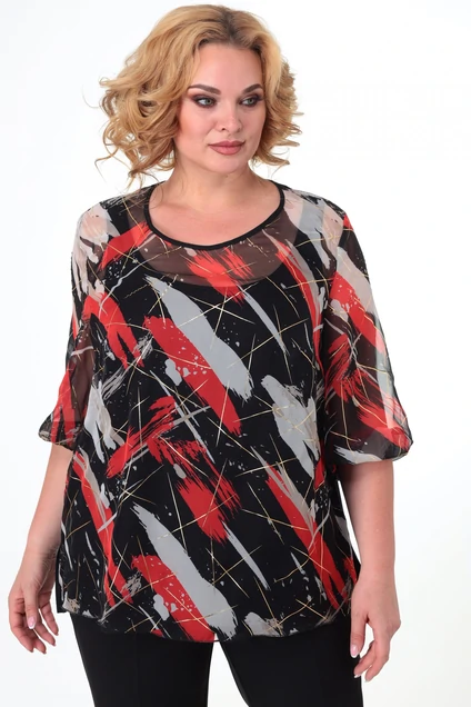 Туника женская перед и рукава шифоновые, спинка и нижний слой переда облегченный трикотаж. Туника прямого силуэта с разрезами по боковым швам. Длина туники 72 см, длина рукава 47 см.
