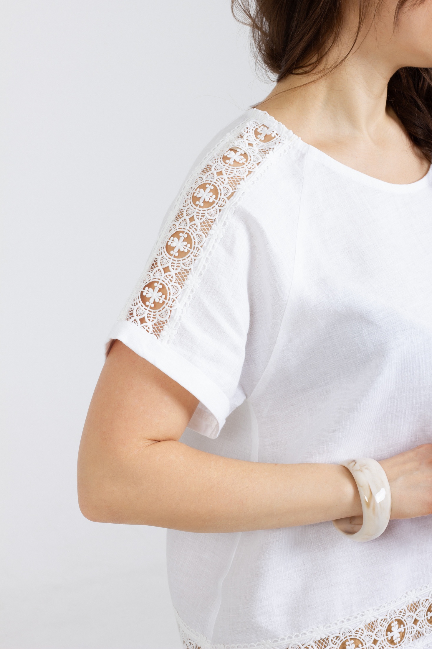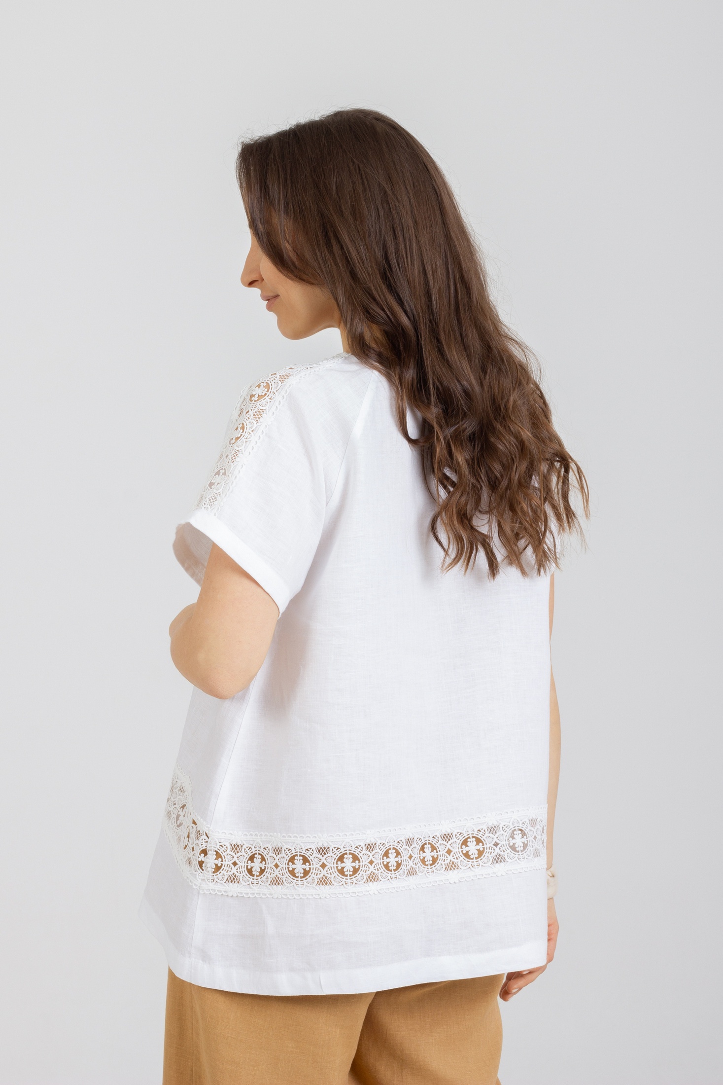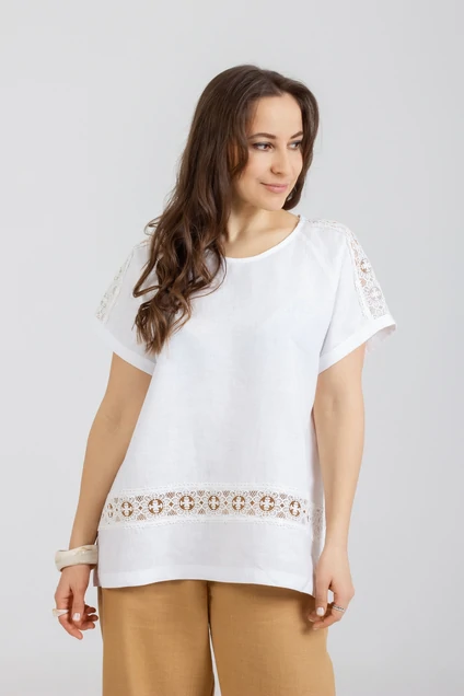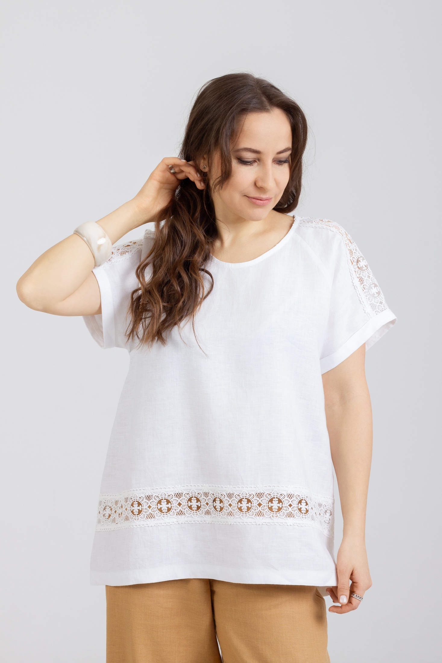 Туника изготовлена из качественного натурального мягкого льна с "эффектом мятости" свободного силуэта с рукавом -реглан.Горловина окантована. По низу изделия и по рукаву- отделка тесьма-шитьё из хлопка.