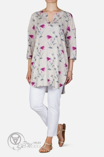 Цвет: бежевый в цветы Ткань: штапель Лёгкая и удобная туника свободного кроя с разрезами в боковых швах. Рукава летучая мышь , застёгиваются на паты. Длина изделия : р -ры 46-50 -87см р- ры 52-58 -93 см Ширина по линии груди: 44р-108см, 46р -112 см , 48р -116 см ,50р -120см, 52р -124 см, 54р -128 см , 56р -132 см, 58р -136 см Длина рукава с учётом плеча – 55 см Рост: 164-170