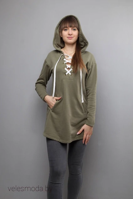 Туника цвета хаки, прямого силуэта с капюшоном. Застежка планка с декоративной шнуровкой. Длинный полуспущенный рукав. Длина изделия: 81 см