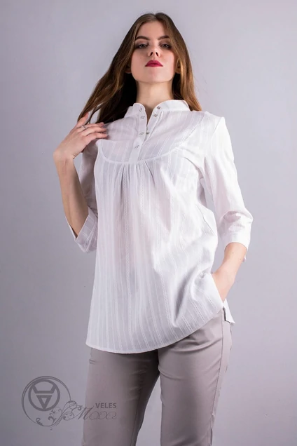 Длина изделия: 71 см Длина рукава: 43 см Комплектация: Туника Характеристика: Туника приталенного силуэта. V-образный вырез. Разрезы по боковым швам. Застежка планка на кнопках. Рукав ¾. Кокетка.