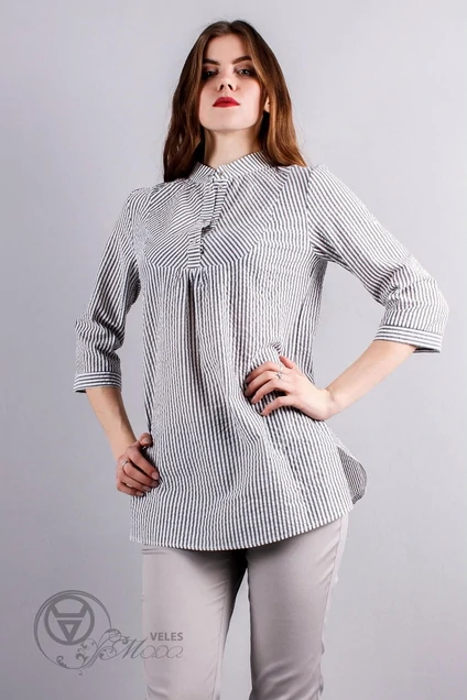 Длина изделия: 71 см Длина рукава: 43 см Комплектация: Туника Характеристика: Туника приталенного силуэта. V-образный вырез. Разрезы по боковым швам. Застежка планка на кнопках. Рукав ¾. Кокетка.