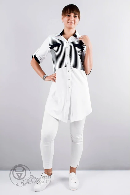 Длина изделия: 86 см Длина рукава: 42 см Комплектация: Туника Характеристика: Туника-рубашка, застежка планка. Рукав 3/4. Фигурный низ, с разрезами по бокам. Рукава с патой.