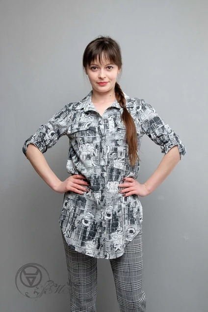 Длина изделия: 76 см Длина рукава: 42 см Комплектация: Туника Характеристика: Туника-рубашка, застежка планка на кнопках. Рукав 3/4. Фигурный низ, с разрезами по бокам. Рукава с патой.