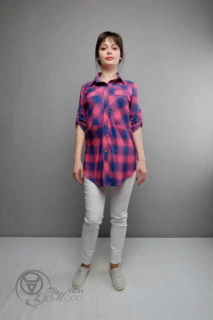 Длина изделия: 76 см Длина рукава: 42 см Комплектация: Туника Характеристика: Туника-рубашка, застежка планка на пуговицах. Рукав 3/4. Фигурный низ, с разрезами по бокам. Рукава с патой.