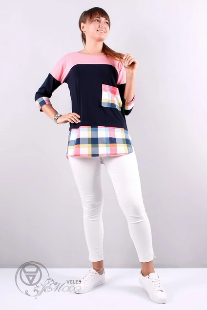 Длина изделия: 76 см Длина рукава: 35 см Комплектация: Туника Характеристика: Туника летучая мышь. Рукав 3/4. Фигурный низ. Накладной карман.
