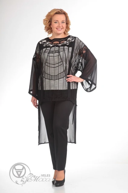 Длина рукава: от горловины-62 см. Длина изделия: перед-72 см , спинка-114 см см. Статус модели: нарядно-повседневное Силуэт: прямой Цвета: черный Описание: Туника свободной формы, выполнена из двух видов ткани: перед - рисунчатая стабильная сетка, спинка и рукав - шифон. Низ туники разноуровневый , по переду длина-72 см , сзади длина-114 см . По бокам небольшие разрезы . Рукав приспущен . длина от горловины -62 см .