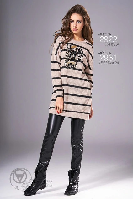Стильная туника оверсайз из мягкой вязаной ткани с продольно полосатым рисунком переплетения. Модель удлиненная со спущенным рукавом. Низ изделия и рукава на манжете. Горловина овальной формы оформлена планочкой. Перед украшен выразительной печатью.