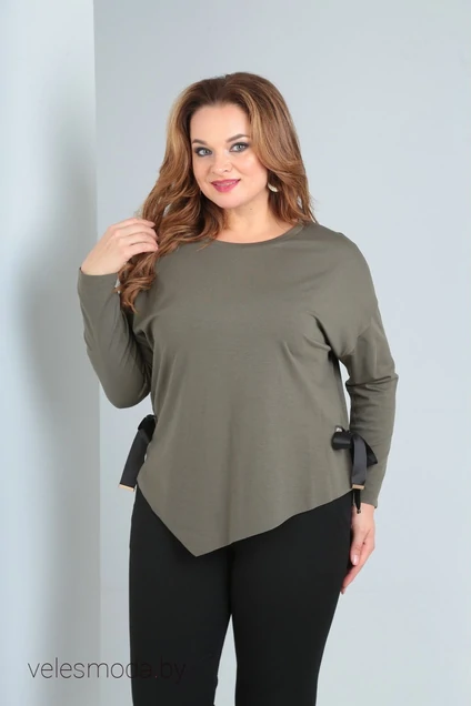 Туника из чудесного» французского трикотажа»-тончайшей вискозной ткани благородного оливкового цвета,укорочённая сбоков,удлиненная спереди и сзади.Туника украшена декоративными элементами в виде бантов из чёрной ленты с золотой отделкой.В сочетании с чёрными классическими брюками или юбкой-карандашом эта туника создаст неповторимый образ и станет украшением не только делового,но и вечернего гардероба. Длина по спинке 64см