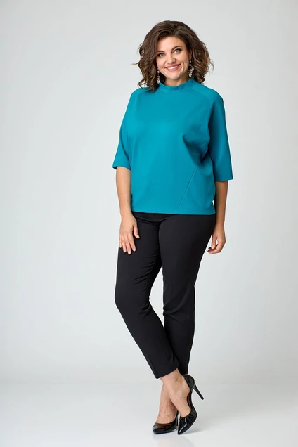 Туника прямого силуэта с цельнокроеным рукавом «летучая мышь». Модель выполнена из плотного трикотажа, в актуальном цвете сезона синий электрик. Благодаря конструктивным подрезам, изделие достаточно свободное, но не объёмное. К низу туника плавно сужается. Горловина округлая, полу лодочка, с небольшим воротником-стойкой. Брюки классические, прямые. Выполнены из трикотажа в рубчик. По переду имитация гульфика. По задней части – отрезная кокетка. Пояс брюк притачной, на резинке. Модель прекрасно подойдет как база для торжественного костюма, так и для повседневной носки.
