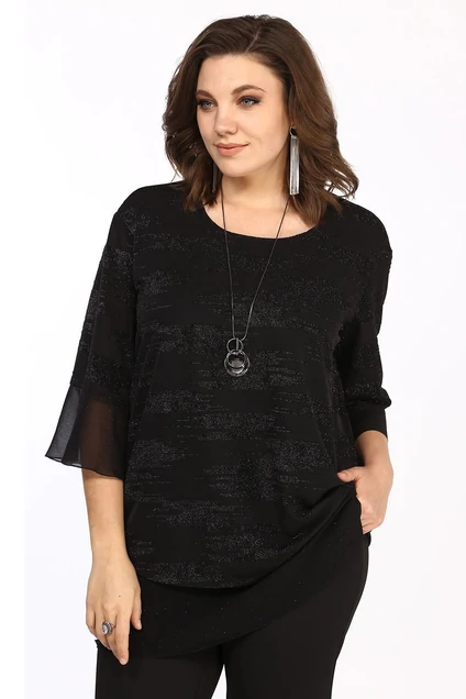 Туника нарядная. Выполнена из двух видов ткани, мягкого трикотажа с бархатистым рисунком и легкого шифона в отделке. Модель прямого силуэта, перед и спинка двойные. Нижняя часть из шифона, удлиненная. Комбинирование двух тканей, создаёт актуальную многослойность модели. При этом образ не перегружен и выглядит достаточно легко и празднично. Рукав втачной, с воланом из шифона по низу. Горловина округлая. Туника прекрасно подойдёт как для торжественных случаев, так и для рабочих будней.