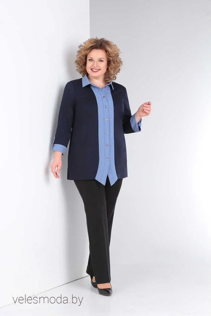 Туника-имитация выполнена из трикотажного полотна и льна-вишера джинсового цвета. Туника имеет воротник на стойке и по переду застежка на пуговицы по всей длине. Низ туники имеет фигурную форму. По бокам имеются разрезы. Длина туники по центру спинки 73 см. Рукав с притачной манжетой и патой на пуговице. Длина рукава 50 см.