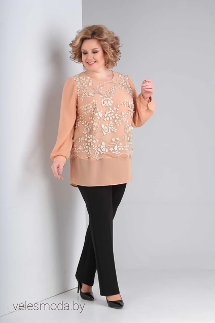 Нарядная туника из шифона и гипюра. Туника свободного прямого покроя с разрезами по бокам. Низ по задней полочке слегка удлиненный и округлой формы. Длина туники по центру спинки 77 см., длина гипюра 57см. Рукав длинный с напуском на притачную манжету. Длина рукава 64 см.