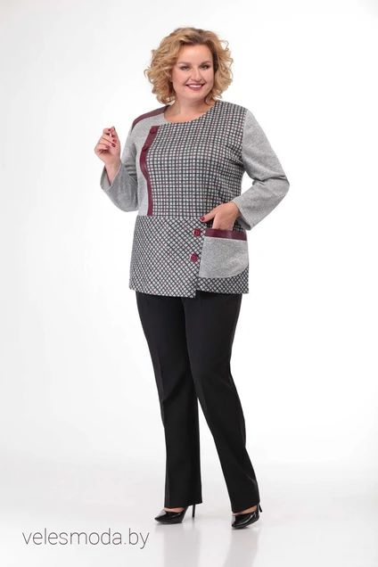 Туника из трикотажного полотна прямого силуэта. Передняя часть туники выполнена из двух видов ткани и отделкой из кожзама. Сбоку имеется большой накладной карман. Спинка и рукава выполнены из однотонной ткани. По бокам туники внизу имеются разрезы. Длина туники по центру спинки 75 см. Рукав длиной 50 см.