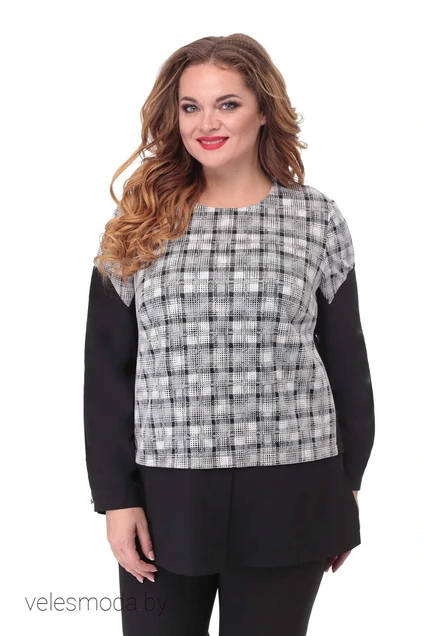 Туника-имитация,основное полотно трикотажное ,Рукава и нижняя часть выполнены из блузочной ткани черного цвета.Вырез горловины округлой формы,на левом плече застежка на пуговицу для удобства.По переду туники нагрудные вытачки .Длина туники по центру спинки 71см. Рукав втачной,длинный на притачной манжете с застежкой на пуговицу длиной 60см.Очень комфортная модель и в тоже время придает стройность фигуре,скрадывая недостатки.