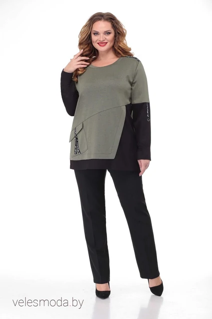 Туника из трикотажного полотна. Туника прямого свободного кроя с втачным рукавом, горловина округлой формы. На передней полочке выполнен косой подрез, в который вставлен функциональный карман. В качестве отделки используется декоративная тесьма на кармане, плече и рукаве. По бокам туники внизу выполнены разрезы для удобства. Длина туники по центру спинки 73 см. Длина рукава 61 см.