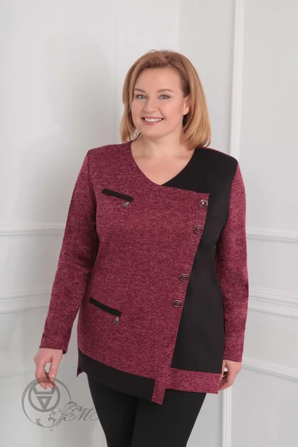 Трикотажная туника. Перед выполнен с имитацией косой застежки. На груди имеется листочка с декоративным украшением, а внизу функциональный карман, также с декоративным украшением. Длина по спинке от верхней точки плеча 78 см для 56-60р и 80 см для 62-66р. Длина рукава 60 см.