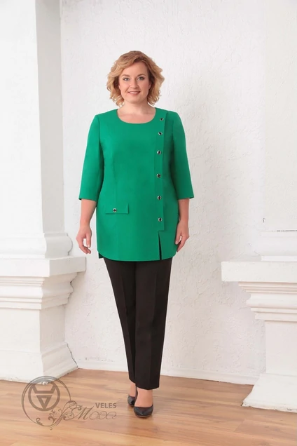 Туника из поливискозы (п\э 62% виск 35% пу 3%),выполнена на боковую декоративную застежку на пуговицах,заканчивающуюся разрезом 14см,а правой полочке декоративный клапан с пуговицей. Длина туники 78см по спинке от верхней точки плеча для 56-60р и 81см для 62-66р. Длина рукава 44см.