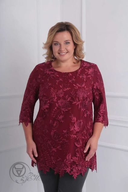Нарядная туника, выполненная из темно-синего блузочного креп-шифона (п/э 100%). По переду и верхней части рукавов наложен гипюр с цветным рисунком (п/э 100%). Длина по спинке от верхней точки плеча 80 см для 56-60р и 83 см для 62-66р. Длина рукава 44 см.