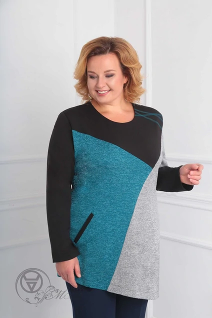 Туника из трикотажного полотна (п/э 73%, виск 23%, п/у 4%) выполнена в комбинации 3-х цветов, есть функциональный карман и декоративная строчка на левом плече. Низ изделия выполнен на косую, по бокам имеются разрезы. Длина туники по центру спинки - 75 см. Рукав длинный - 60 см.